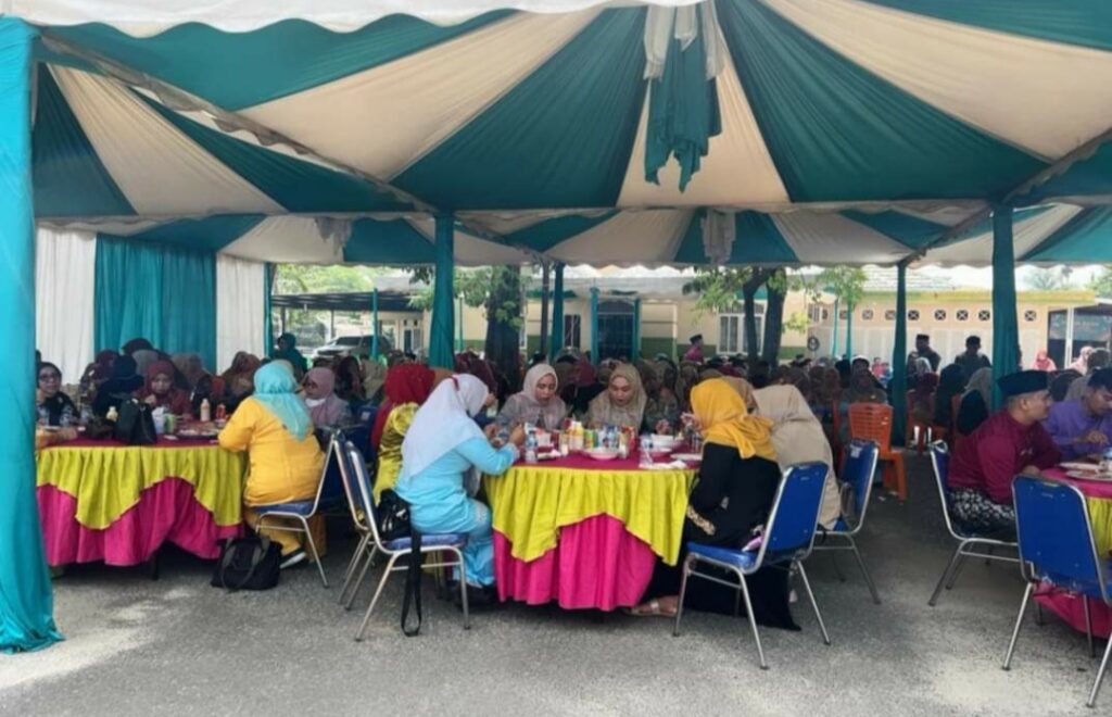 Selain diisi dengan santap siang bersama, halal bI halal juga diisi dengan tausiyah oleh ustad DR. H Maghfirah, MA hingga sesi saling berjabat tangan.(Mel)