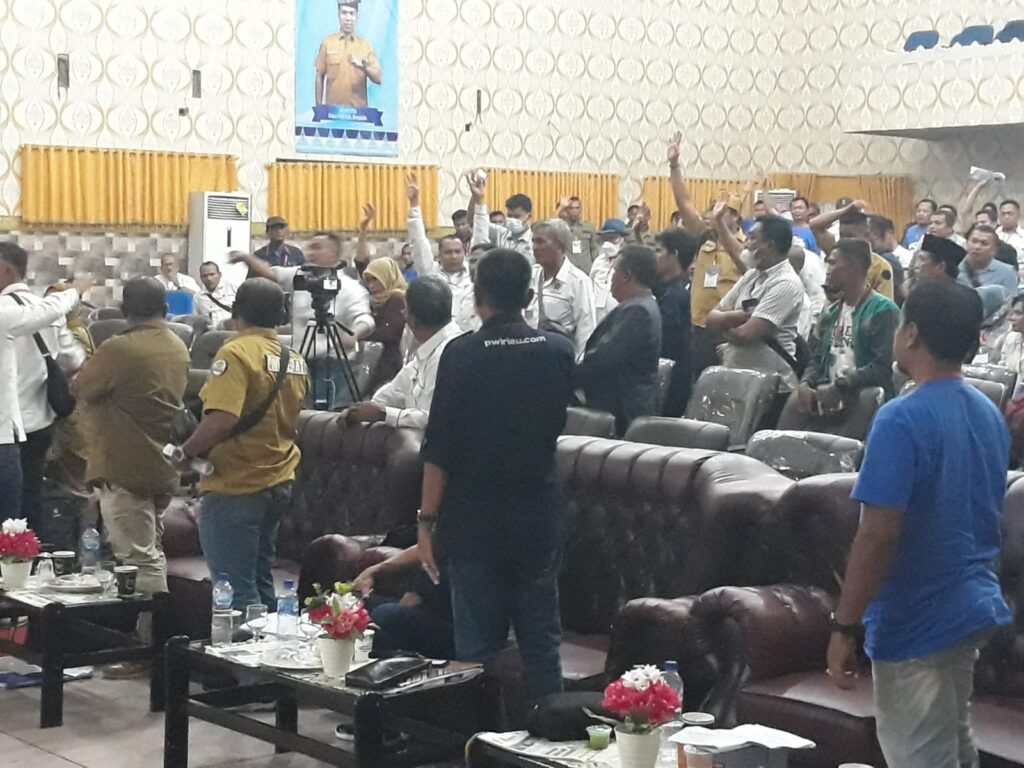 Meski dihadiri perwakilan dari PWI Pusat dan Wakil Bupati (Wabup) Bengkalis, Bagus Santoso yang mencoba untuk menenangkan, puluhan pemilik suara yang terbakar emosi seakan tak menggubris himbauan tersebut.