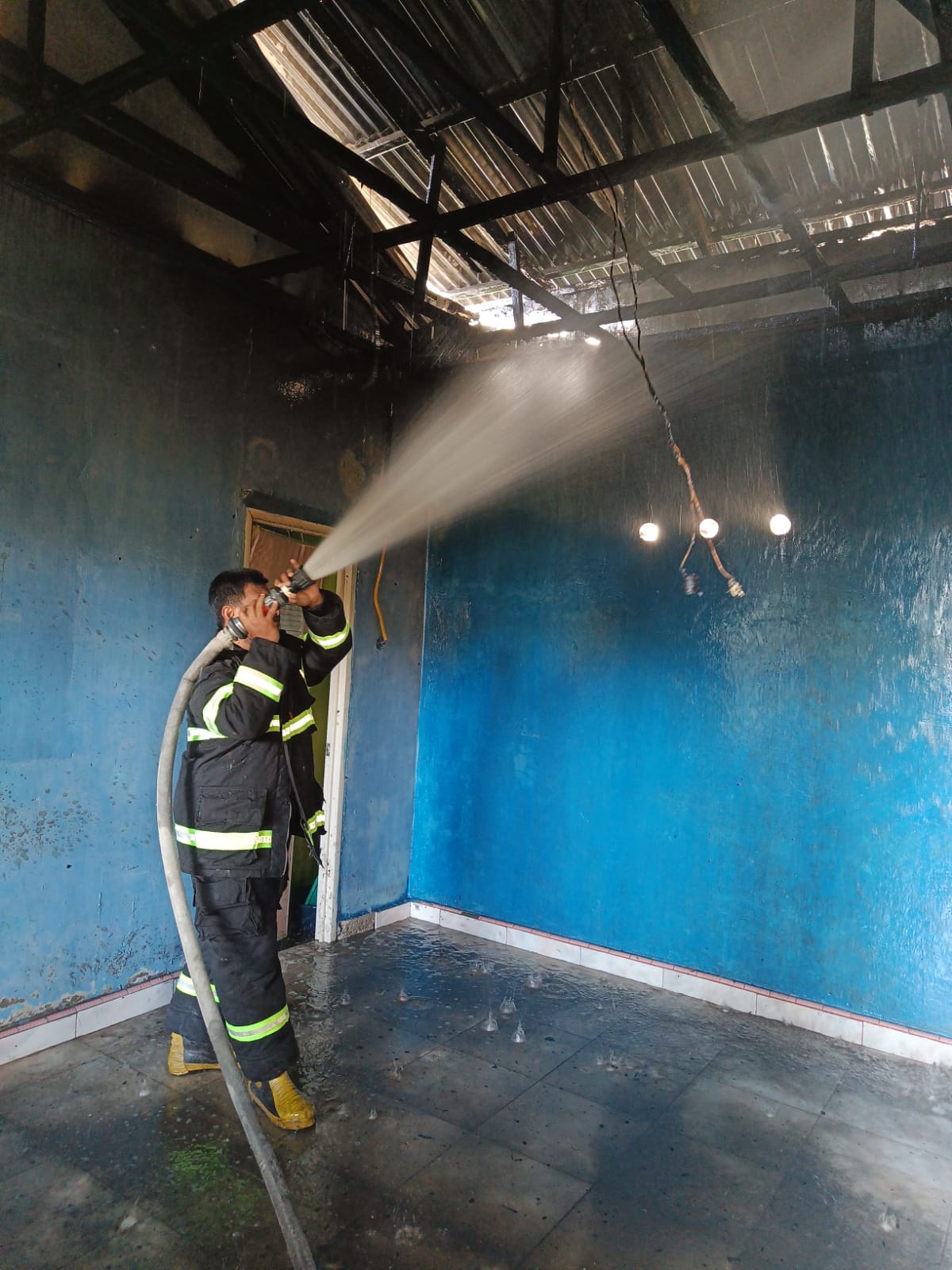 “Api hanya bermain pada plafon rumah dan sudah padam. Kini kita lakukan pendinginan guna mencegah api kembali marak,”ujar Komandan regu 02 Damkar, Jefrianto.