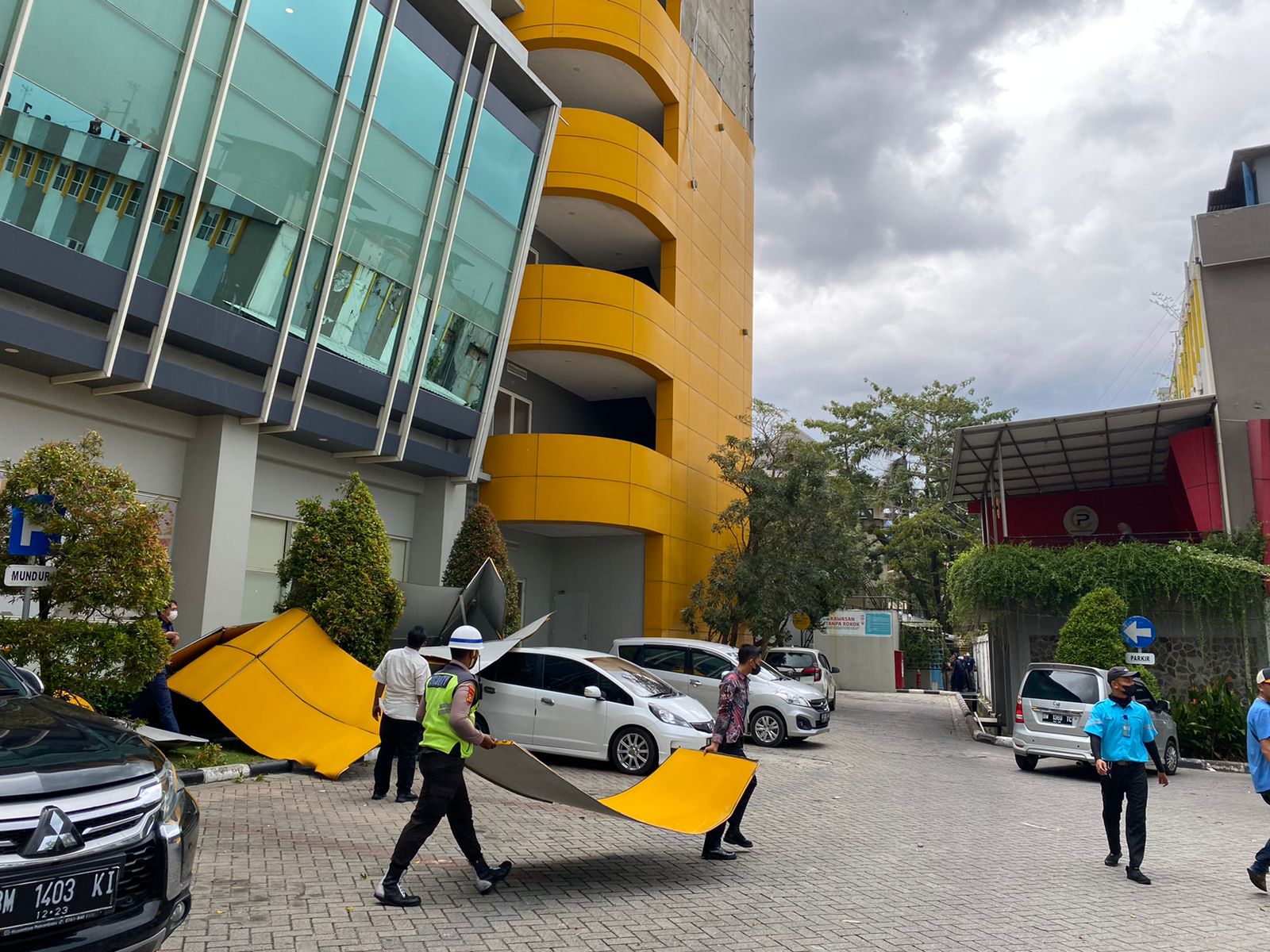 Jagariau – PEKANBARU – Naas, Material Alumunium Composite Panel (ACP) Rumah Sakit Awal Bros Sudirman Pekanbaru jatuh, Jumat (14/10/22). Akibatnya, 7 unit kendaraan yang terparkir di bawah bangunan itu tertimpa dan mengalami kerusakan.
