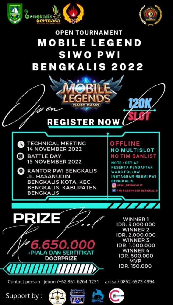 Jagariau – BENGKALIS – Persatuan Wartawan Indonesia (PWI) melalui Seksi Wartawan Olahraga (SIWO) nya, menggelar Pertandingan e – sport (Game Digital) Mobile legend. Mengambil tempat di Kantor PWI paling representatif itu, rencana akan digelar pada Selasa (15/11/22) hingga Jum’at (18/21/22) mendatang.