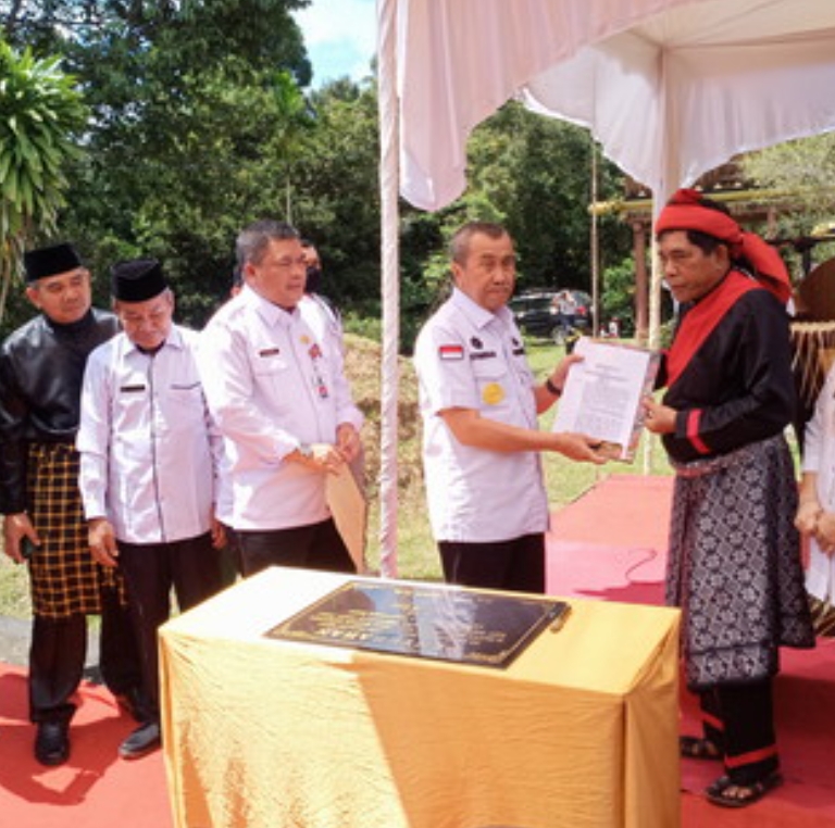 Jagariau – PEKANBARU – Gubernur Riau (Gubri) Syamsuar menyerahkan Surat Keterangan (SK) Pengakuan Masyarakat Hukum Adat dan Hutan Adat (Imbok Ayo) Suku Sakai Bathin Sobanga di Desa Kesumbo Ampai, Kecamatan Bathin Solapan, Bengkalis, Rabu (9/11/22).