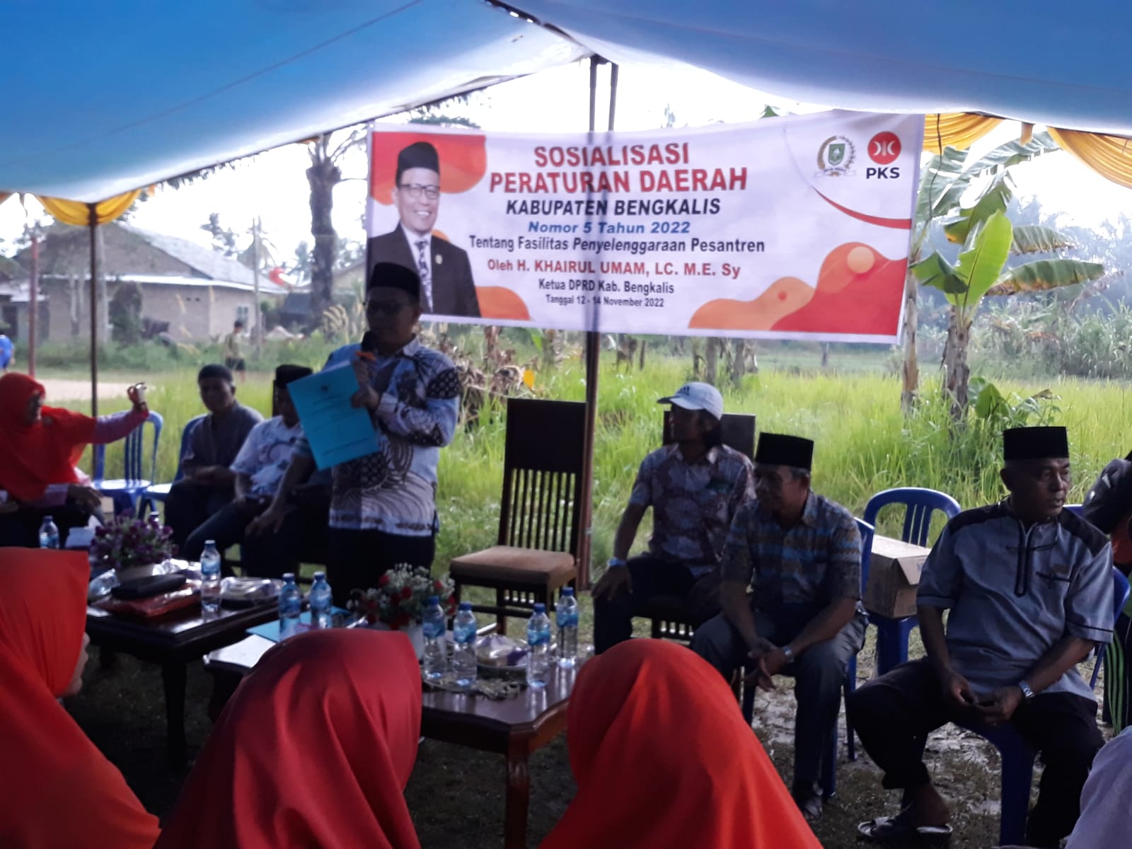 Meski berlangsung dibawah guyuran hujan deras disertai angin kencang dan dentuman halilintar, namun tak menyurutkan niat mensosialisasikan Perda Kabupaten Bengkalis Nomor 5, tahun 2022 tentang Fasilitas Penyelenggaraan Pesantren di Kelurahan Duri Timur, Ahad (13/11/22).