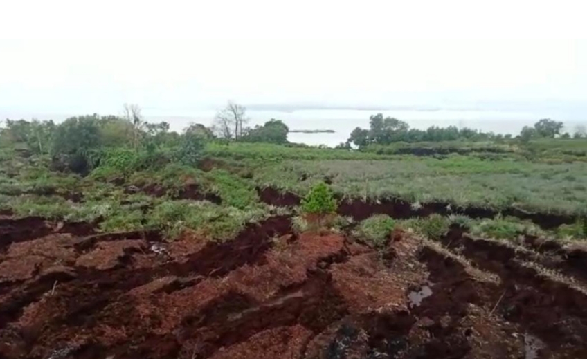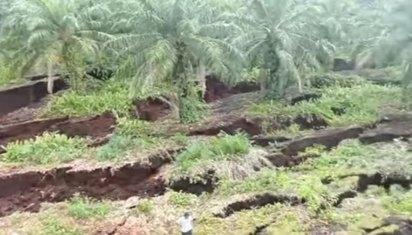 Lahan perkebunan berukuran sekitar 1.000 meter x 1.000 meter, longsor ke laut setelah diguyur hujan deras semalaman yang menimbulkan retakan-retakan hebat dari permukaan tanah.