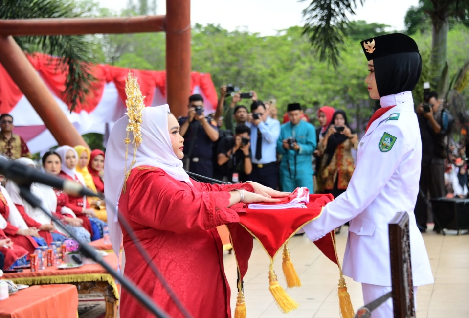 Selaku pembawa baki, Wulan Ramadhani, selangkah-demi selangkah menaiki tangga panggung. Bupati Kasmarni dengan sigap menyerahkan sang saka merah putih kepada siswi asal SMAN 1 Mandau ini.