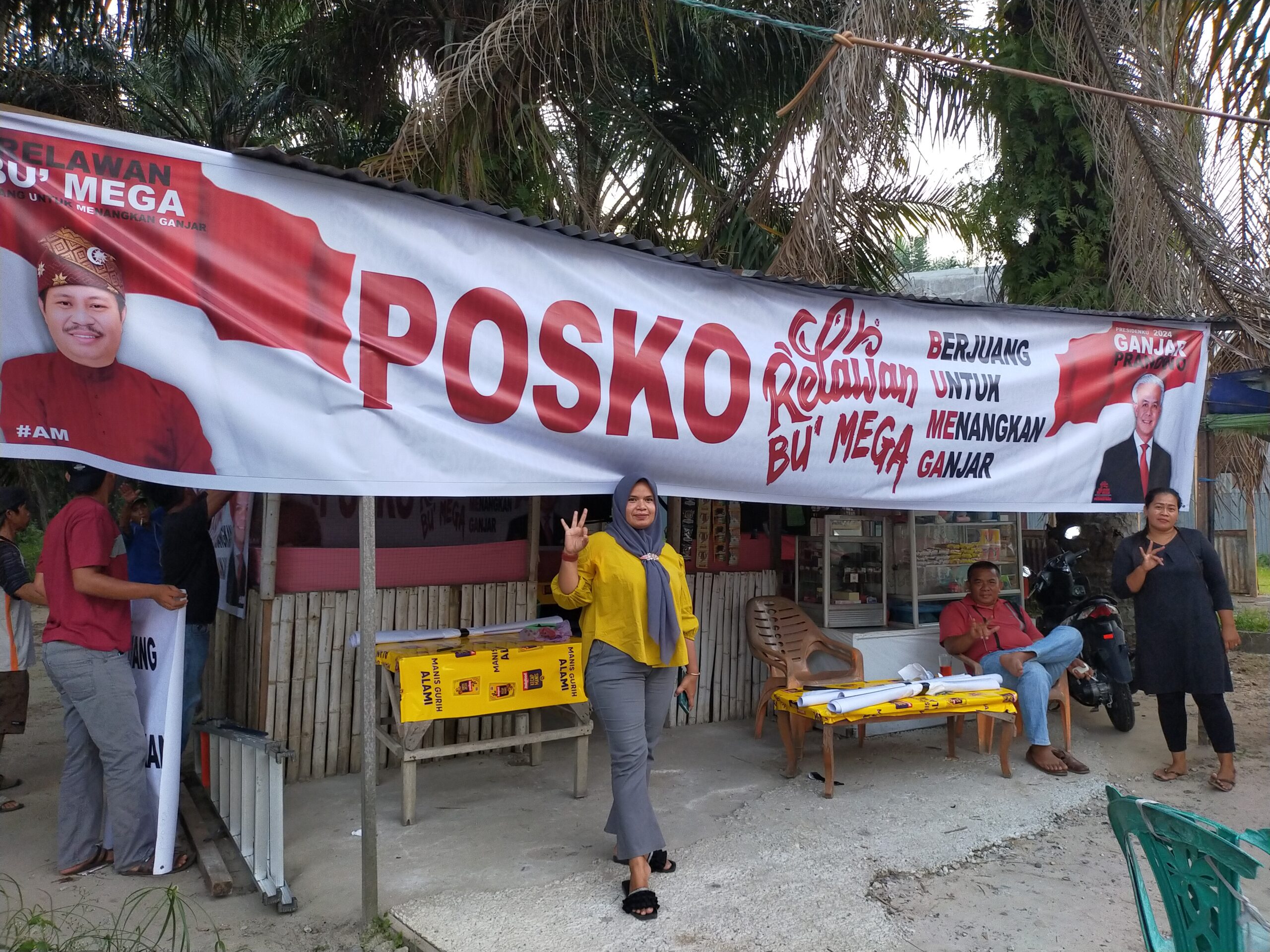 Berdiri di Jalan Baiturrahman, Posko dengan tema “Relawan Bu’ Mega Berjuang Untuk Menangkan Ganjar” itu terbentang memanjang disalah satu warung dengan tampilan Capres Ganjar dan Bupati Bengkalis Periode 2015 – 2020, Amril Mukminin (AM).