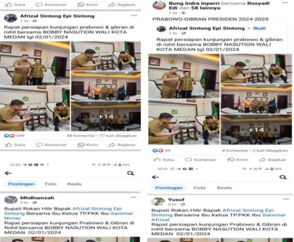Dalam tangkapan layar Handphone, foto foto itu setidaknya telah diunggah ulang oleh sembilan akun sosial media Facebook lainnya selain akun Facebook milik Afrizal Sintong atau Epi Sintong. Kegiatan tersebut merupakan kunjungan kerja Afrizal Sintong sebagai Kepala Daerah Bupati Rokan Hilir ke Kepala Daerah Walikota Medan yang dalam kegiatan tersebut turut serta para ASN dan Ketua PKK Kabupaten Rokan Hilir.