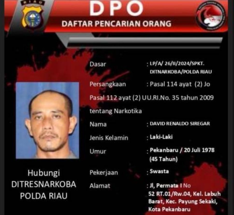 Jagariau – PEKANBARU – David Renaldo Siregar (DRS) pemilik 640 butir Pil Ekstasi terus diburu Tim Direktorat Reserse Narkoba Polda Riau. Pasalnya, DRS warga Jalan Permata I, Nomor 52, RT 01, RW 03, Kelurahan Labuh Baru Barat, Kecamatan Payung Sekaki, Kota Pekanbaru itu kabur saat dilakukan penangkapan beberapa waktu lalu hingga masuk dalam Daftar Pencarian Orang (DPO).
