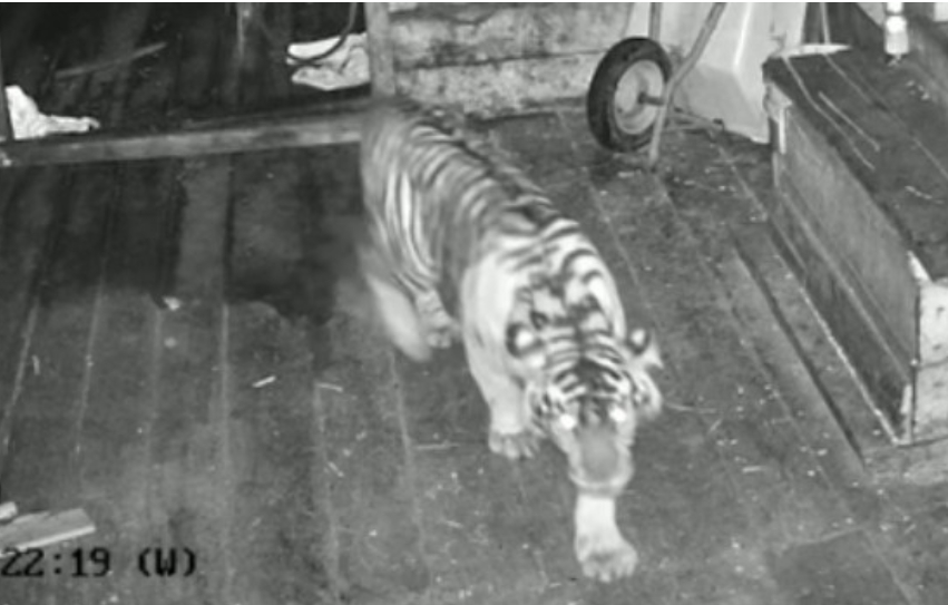 Dua video tersebut diambil dibangunan kayu. Video pertama yang berdurasi 24 detik, pada pukul 18.51 WIB, sosok harimau terlihat mengejar seekor anjing, dan berhasil menerkamnya.Anjing tersebut diterkam, dan dibawa lari oleh predator dilindungi itu.