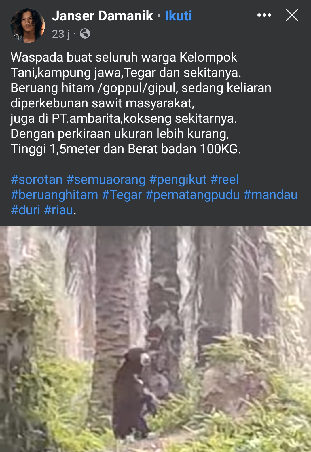 Hal tersebut tampak dalam unggahan media sosial (Medsos) Facebook bernama Janser Damanik, yang dibagikan kembali oleh akun bernama Robi Kiteng berdurasi 3.55 detik, Senin (20/5/24) dengan tulisan “Waspada buat seluruh warga kelompok Tani, Kampung Jawa, Tegar dan sekitarnya. Berjuang hitam/goppul/gipul, sedang berkeliaran diperkebunan masyarakat, juga di PT Ambarita, kokseng sekitarnya. Dengan perkiraan ukuran lebih kurang, Tinggi 1,5 meter dan berat badan 100 Kg”.