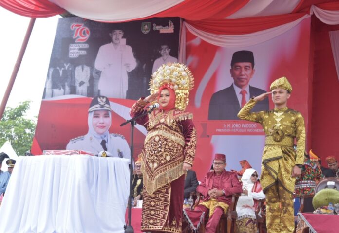 Berlangsung dilapangan Tugu, Bengkalis, Bupati perempuan pertama di Riau itu tampak tampil mempesona dengan mengenakan pakaian adat Minang kabau berwarna merah.