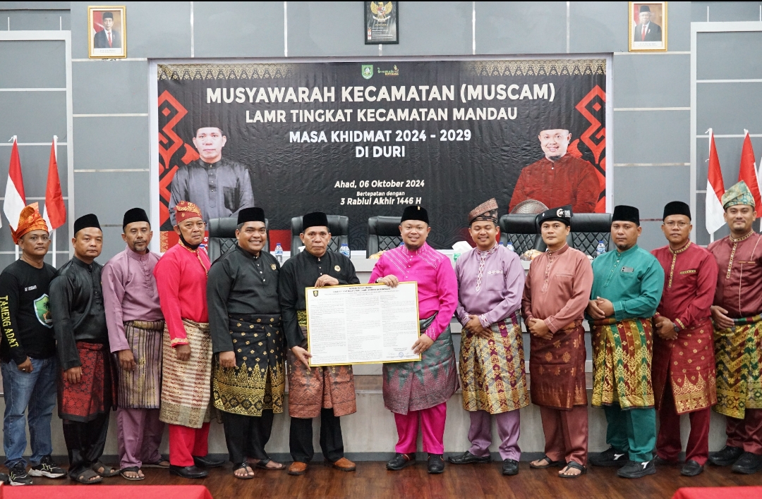 Jagariau – DURI – Camat Mandau, Riki Rihardi yang juga Payung adat, Ahad (6/10/24) menghadiri Musyawarah Kecamatan (Muscam) Lembaga Adat Melayu Riau (LAMR) Kecamatan Mandau.