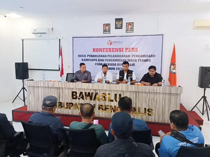 Jagariau – BENGKALIS – Badan Pengawas Pemilu (Bawaslu) Kabupaten Bengkalis, Senin (25/11/24) menggelar konferensi pers penanganan pelanggaran selama tahapan kampanye Pilkada Serentak Tahun 2024. Selain itu, sejumlah hasil pengawasan yang dilakukan juga turut disampaikan, seperti pengawasan dimasa tenang.