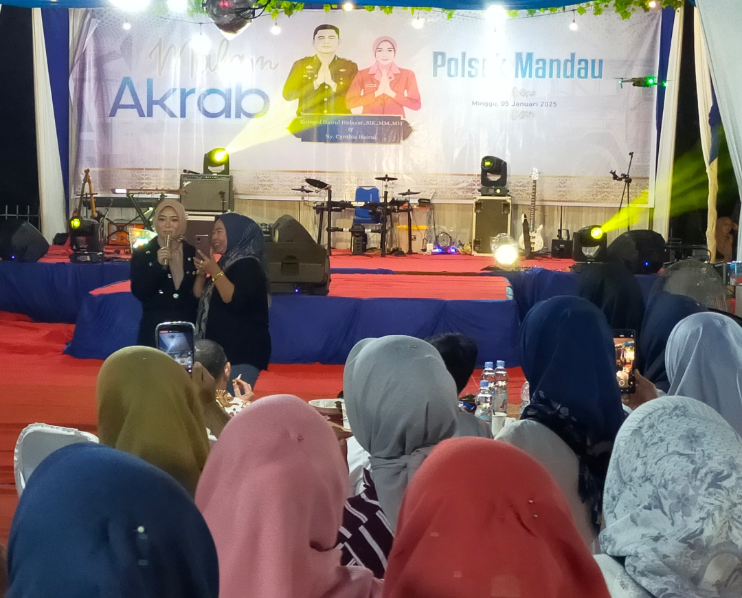 Dihibur artis daerah Sumatera Barat (Sumbar), Fauzana, malam Akrab sekaligus melepas Kapolsek Mandau sebelumnya, Kompol Hairul Hidayat dalam tugasnya, ribuan masyarakat Kota penghasil minyak bumi, tampak larut hingga pergantian malam.