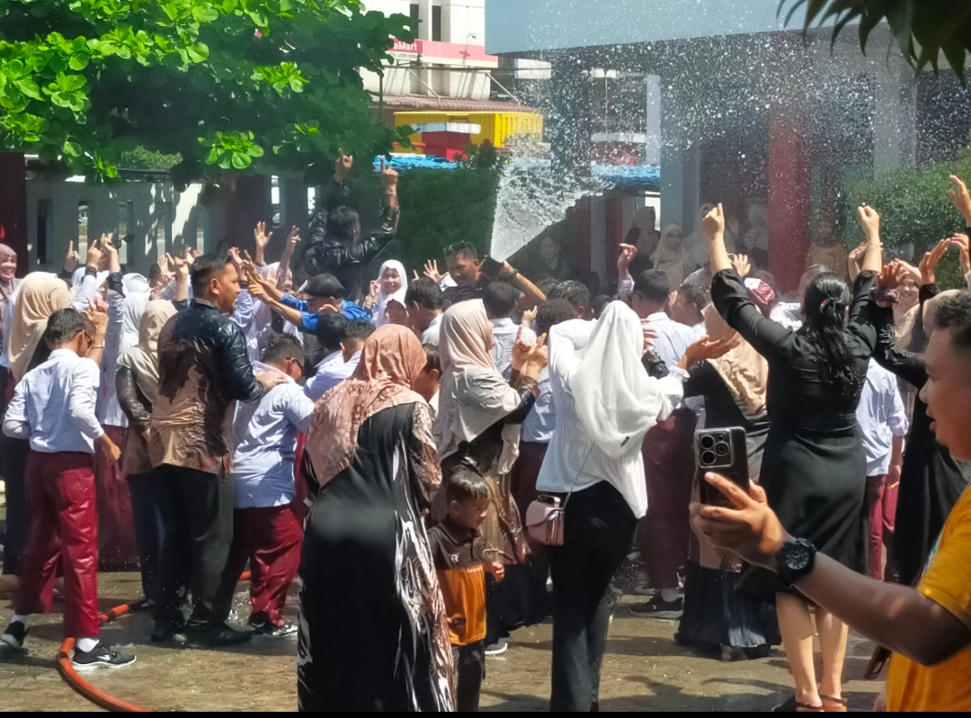 Salah satu cara untuk itu dilakukan anak anak, wali murid dan guru SDN 28 Mandau yang terletak dibilangan Jalan Hang Tuah, Kota Duri, Kecamatan Mandau, Selasa (3/6/25) dengan Mandi bareng dibantu mobil Pemadam kebakaran (Damkar) dihalaman sekolah.