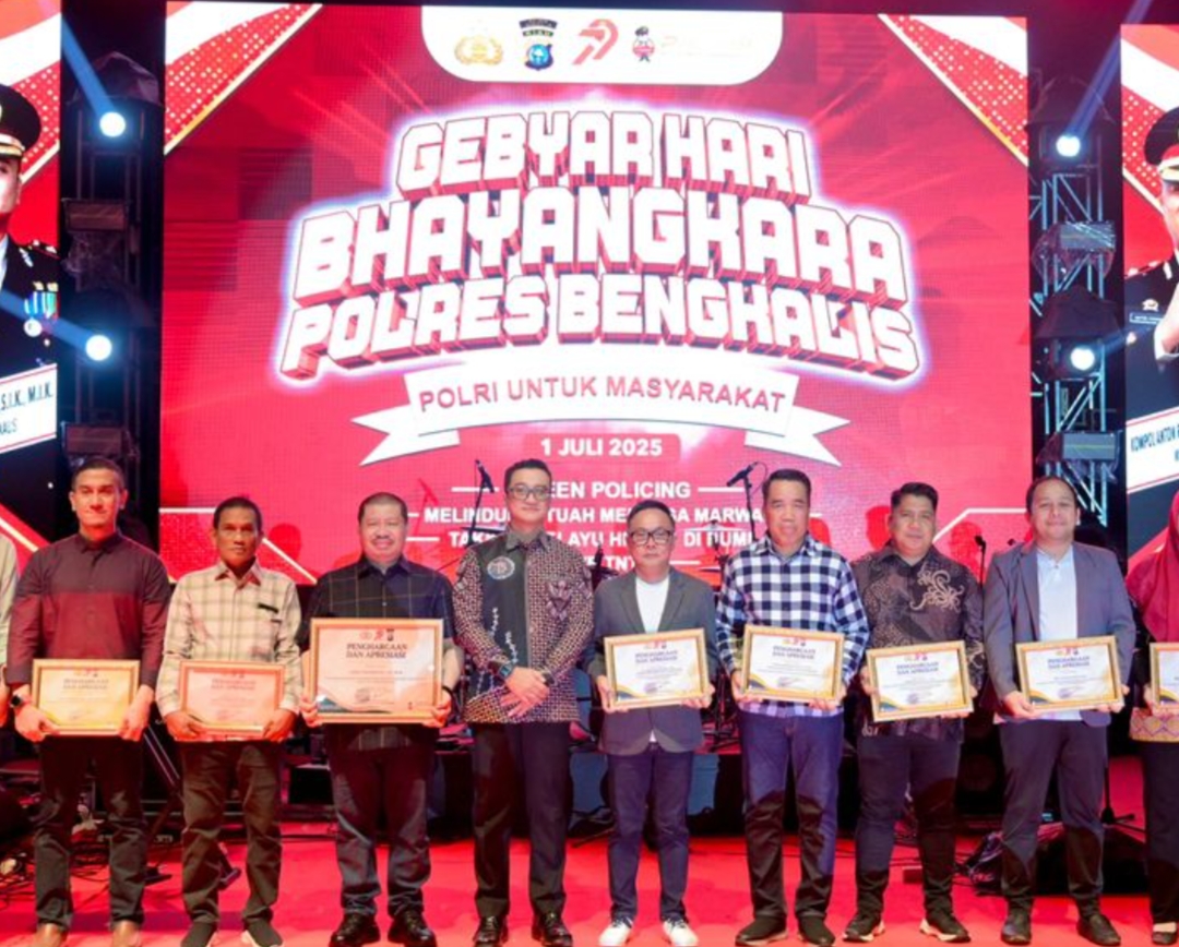 Pada kegiatan tersebut, Kapolres Bengkalis AKBP Budi Setiawan turut memberikan piagam penghargaan kepada sejumlah instansi yang telah turut berkolaborasi dan mendorong tugas serta fungsi Polri di Kabupaten Bengkalis.