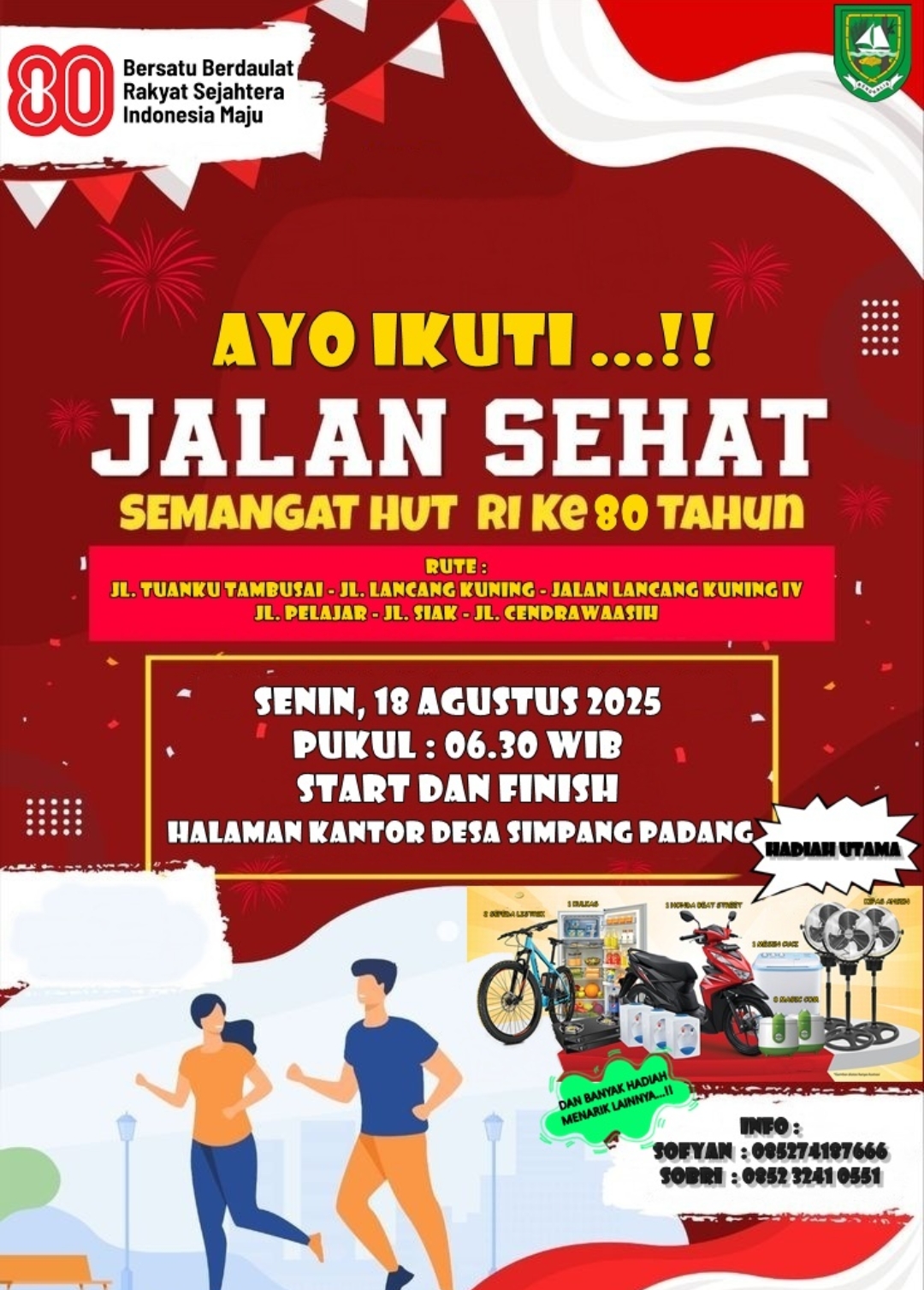 Jagariau – BATHIN SOLAPAN – Sempena memeriahkan Hari Ulang Tahun Republik Indonesia (HUT – RI) ke – 80, Pemerintah Desa Simpang Padang, Kecamatan Bathin Solapan, Bengkalis menggelar Jalan Sehat, Senin (18/8/25) mendatang.