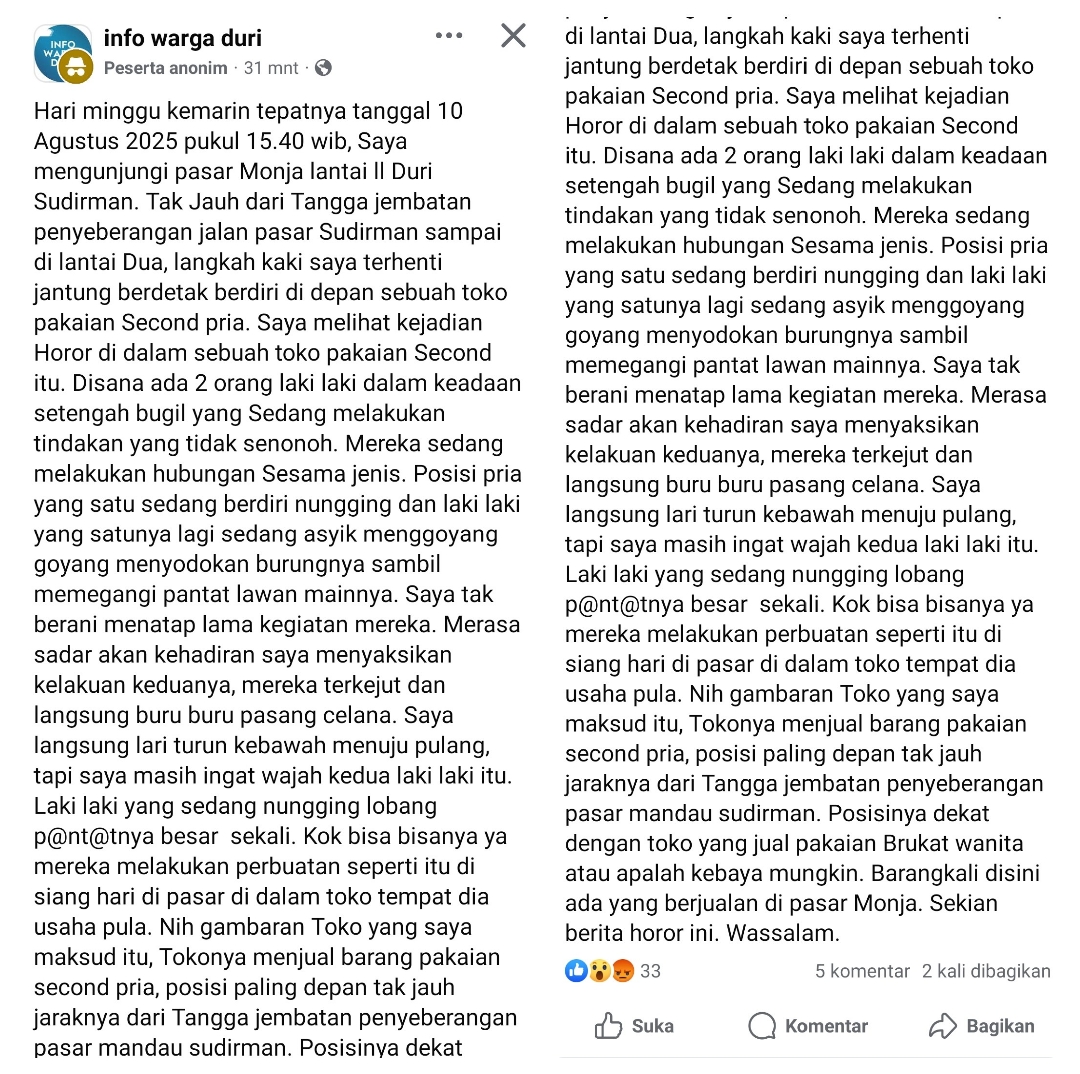 Jagariau – DURI – Diduga tak kuasa menyaksikan adegan syur sesama jenis (laki laki) di dalam dikawasan pertokoan Pasar Mandau Raya, seorang nettizen berkeluh kesah mencurahkan isi hatinya di Media Sosial (Medsos) Facebook ‘Info warga duri’, Ahad (17/8/25).