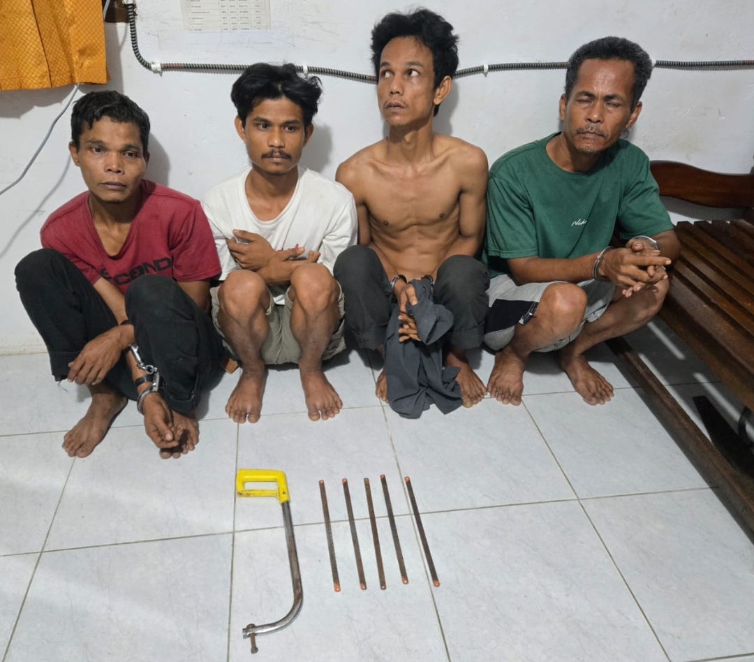 Selain keempat pelaku, sejumlah barang bukti turut diamankan diantaranya 22 Potong Pipa Besi Production Line ukuran 3 inci dan 4 Inci sepanjang masing masing 2 meter yang disembunyikan didalam kebun kelapa sawit, 1 buah tangkai gergaji dan 5 buah mata gergaji.